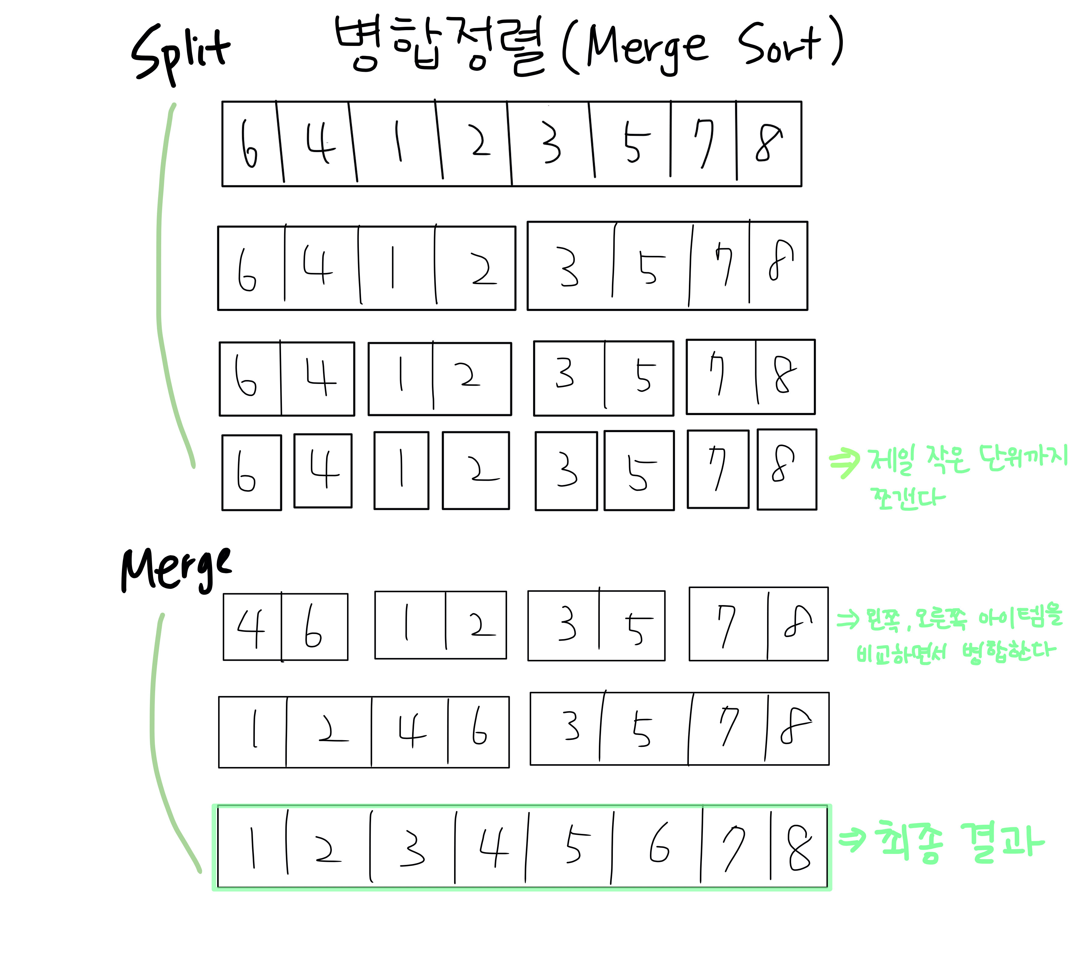 - 합병 : 작은 문제의 해를 합하여(merge) 원래 문제에 대한 해를 구함