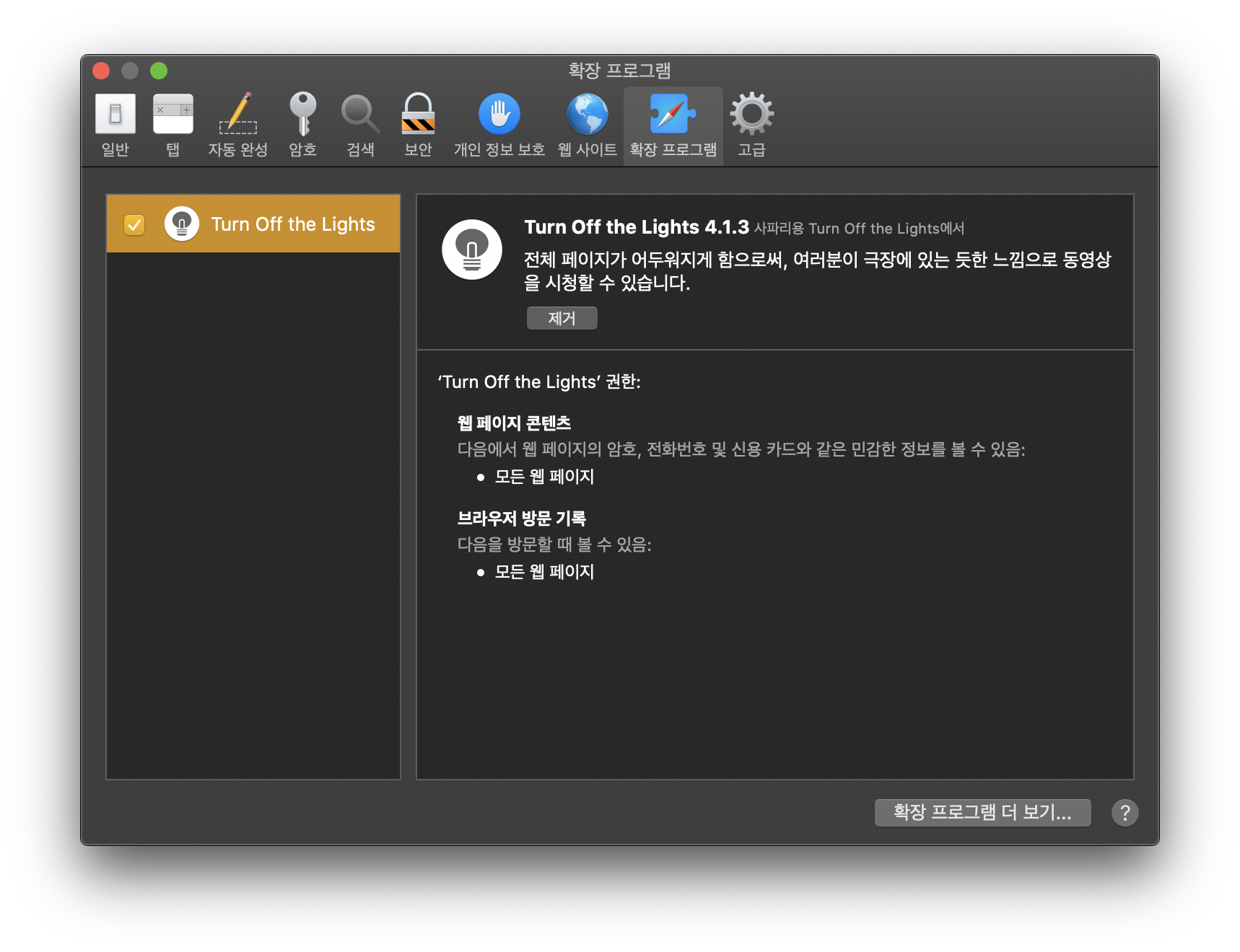 예시 화면 - Turn Off the Lights 를 설치하고 앱을 실행하면 Safari 설정에서 '활성화'하라고 팝업이 뜸